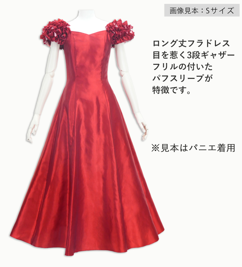 ・3段ギャザーパフスリーブのシャンタンロング丈フラドレス