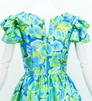 トップ > すべての商品 > 【ミディ丈】 フラドレス 3段フリルスリーブ ハイビスカス ブルー×イエローグリーン S-Lサイズ J3100blyegr